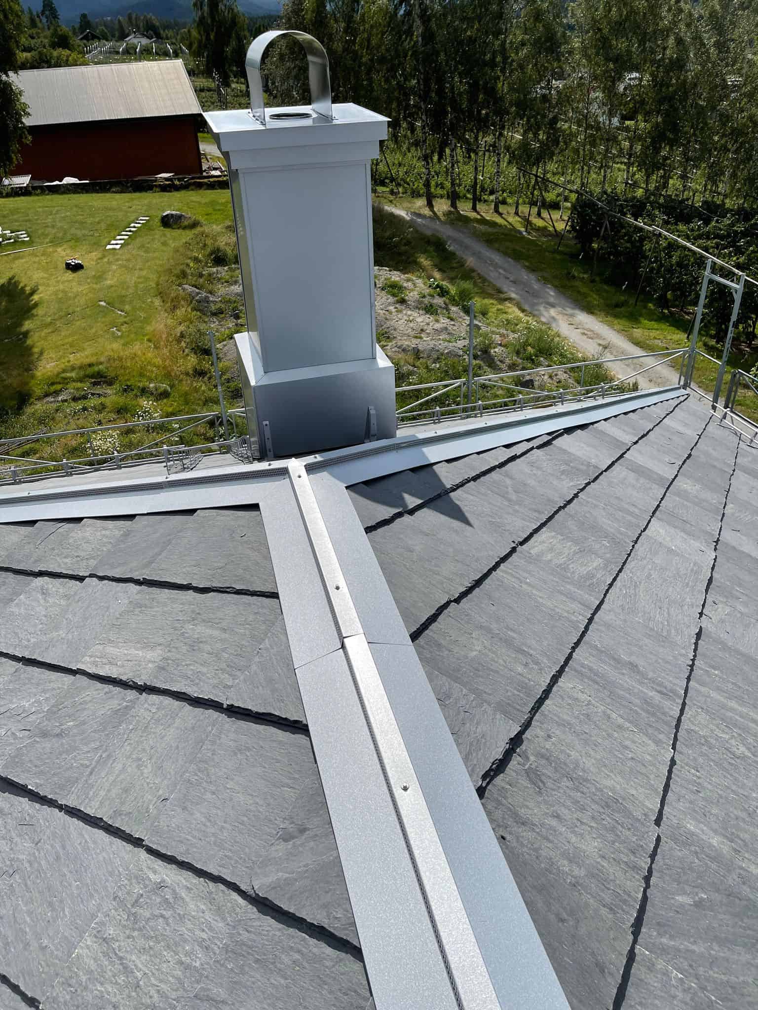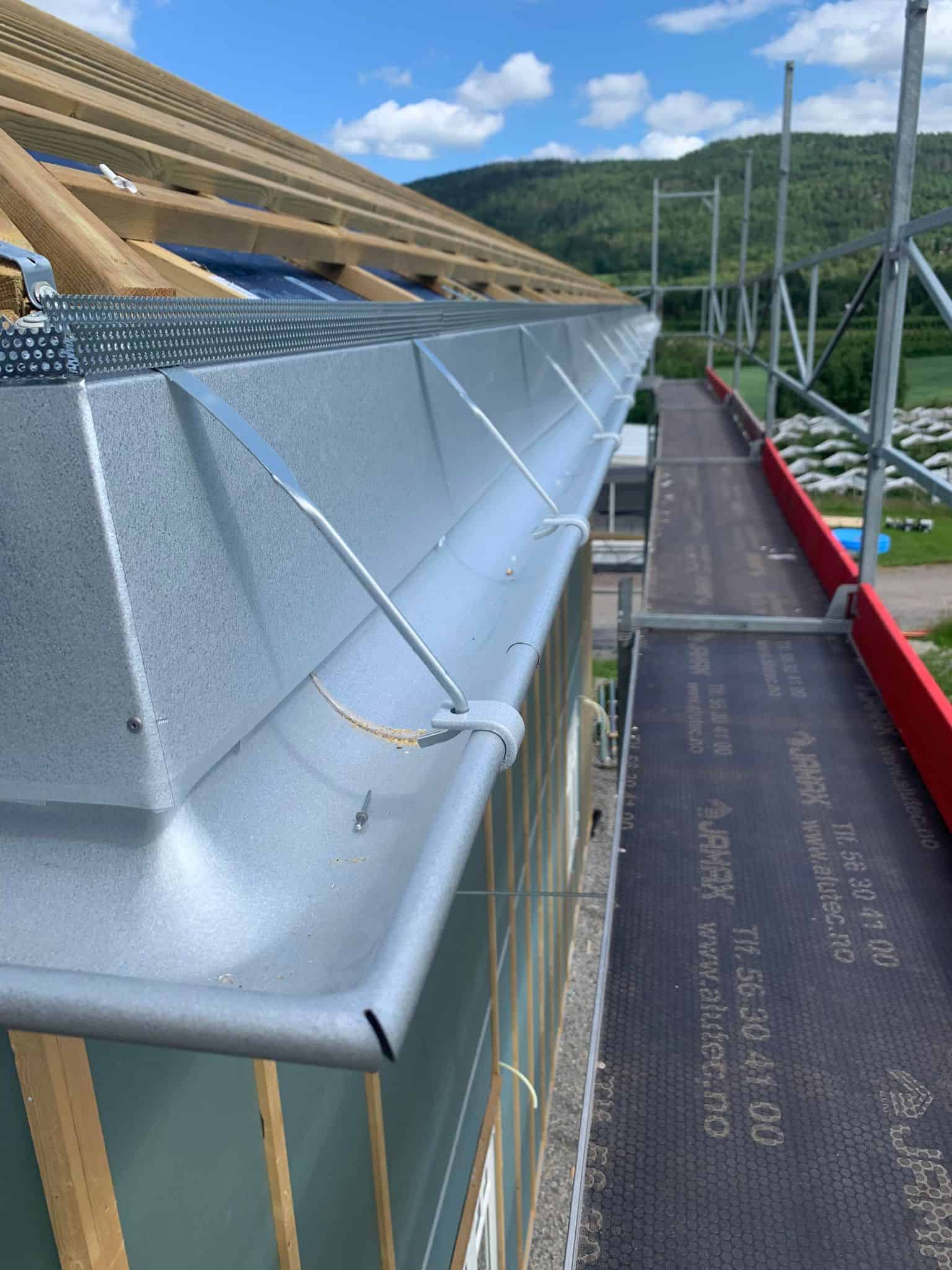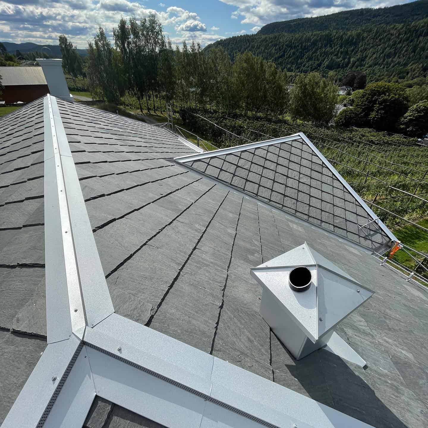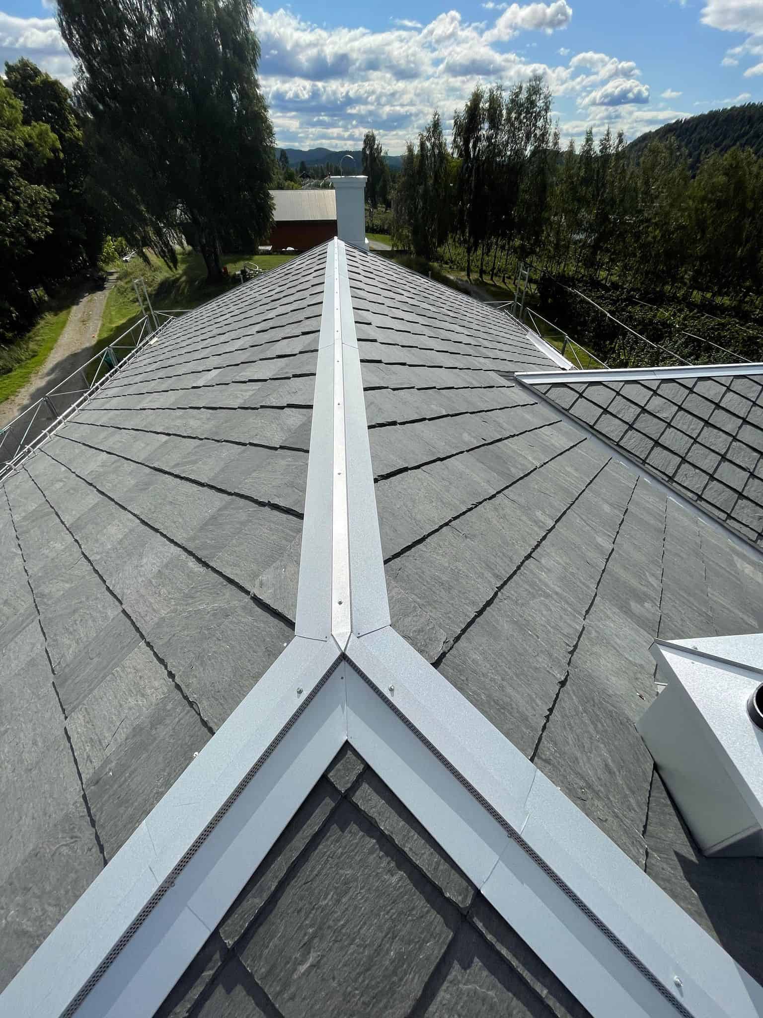 Vi ble engasjert av tømrer for montering av renner og beslag på ett skifertak på en enebolig i Hvittingfoss. Her har vi montert alle beslag og renner i aluzink. Mønebeslag er spesiallaget med «perforering» for å opprettholde lufting igjennom møne.