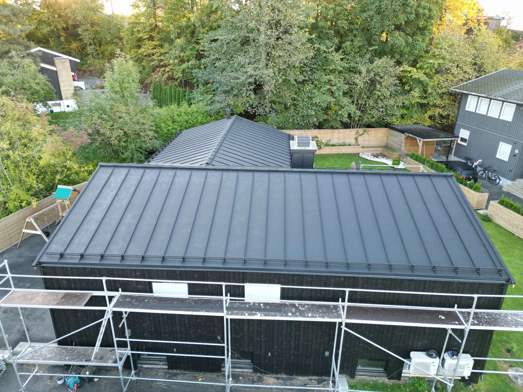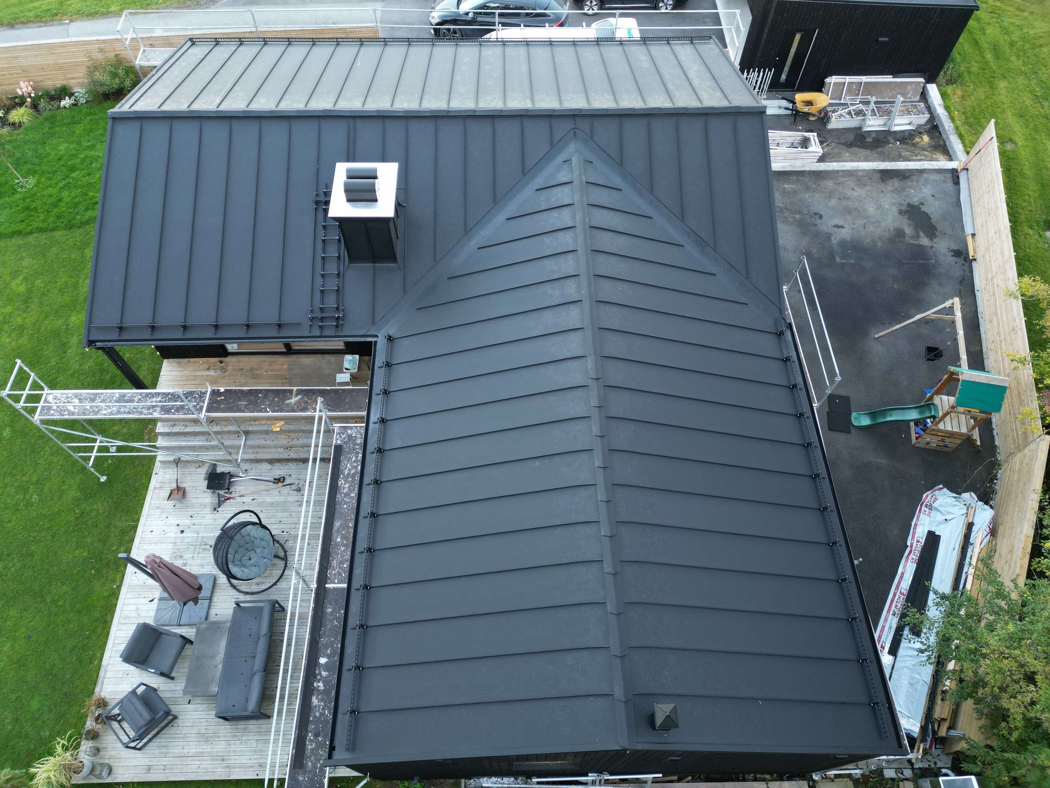Dette taket er båndtekket med Prefa sort men kan leveres i utallige farger og matterialtyper. Dette er ett aluminumstak med 40år lakk/fargegaranti. Aluminium er rustbestandig, bruddsikkert, tåler ekstreme stormbelastninger og gir pålitelig beskyttelse takket være materialets stabilitet. Hvilket gjør dette til ett meget kostnadeffektift og lekkert tak.
