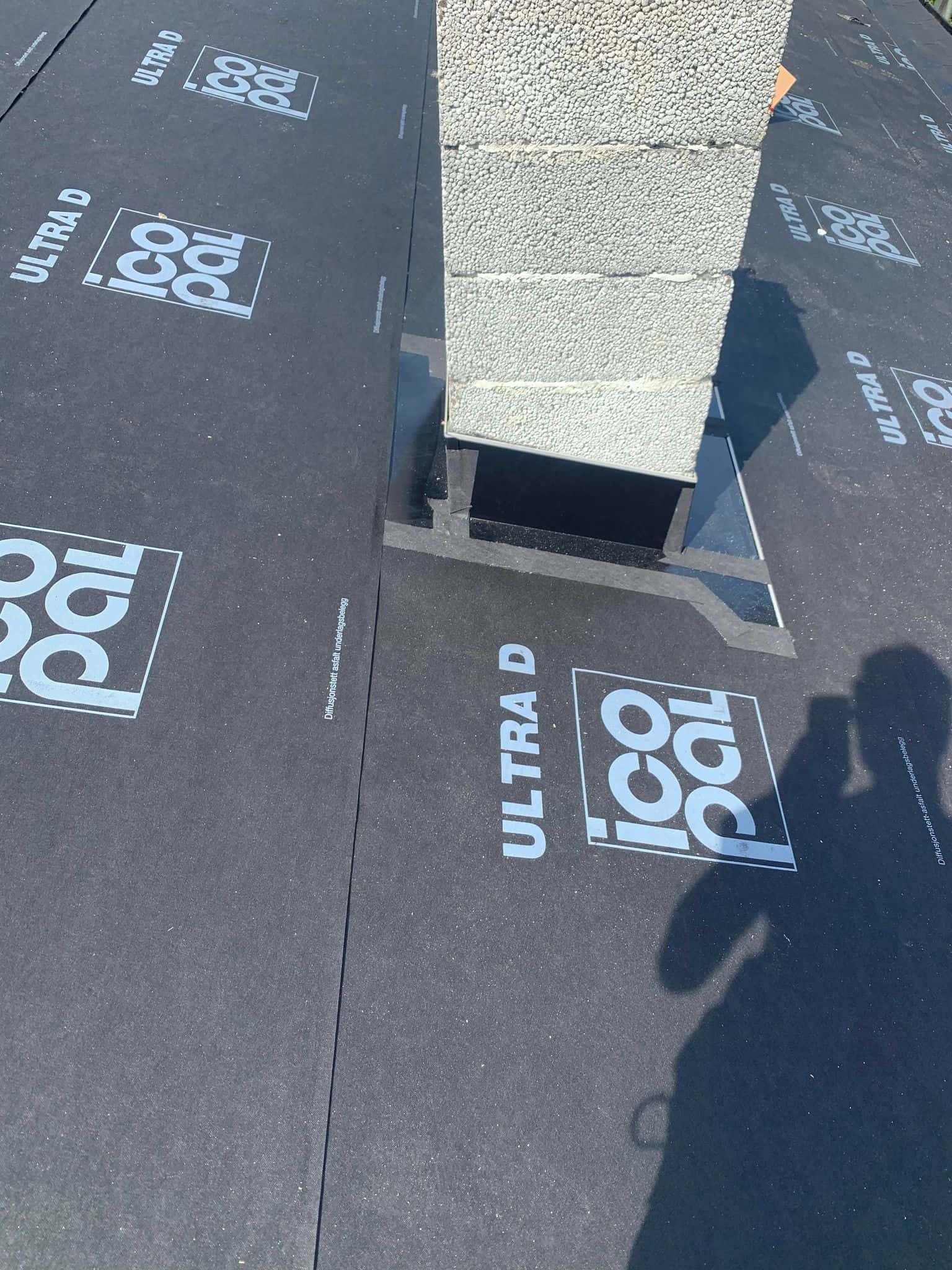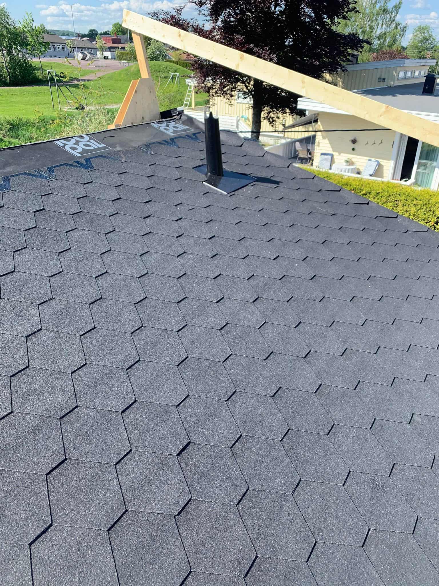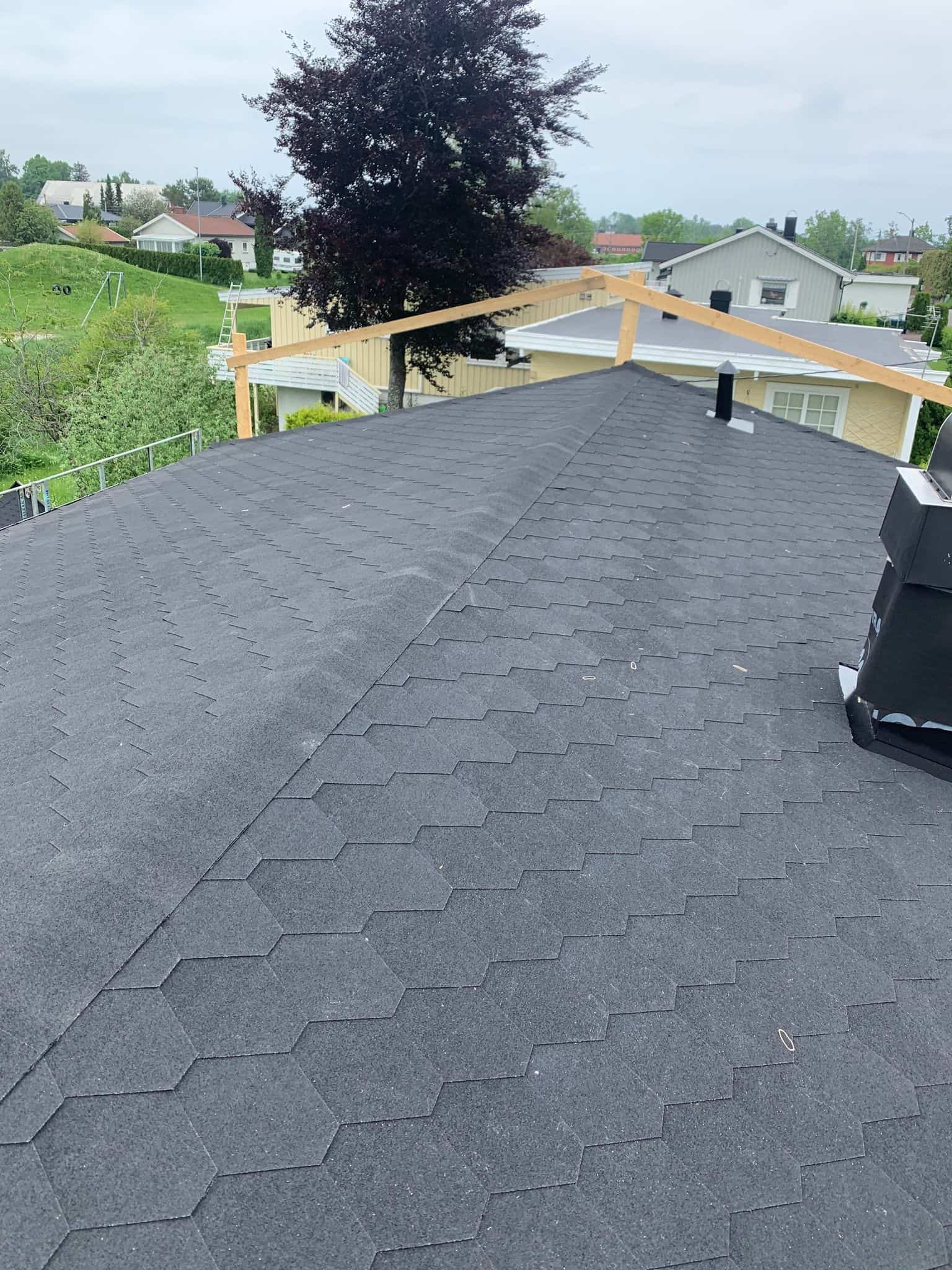 Sommeren 21 ble vi engasjert til en taktekking med takshingel hos en privatkunde. Her har vi revet av gammel takshingel, samt byttet rupanel som hadde fuktskader. Så har vi lagt ny undertakspapp på taket, før vi utførte en skikkelig undertetting av alle gjennomføringer og la ny takshingel i farge kullsort. Beslag og renner i farge sort Hps.