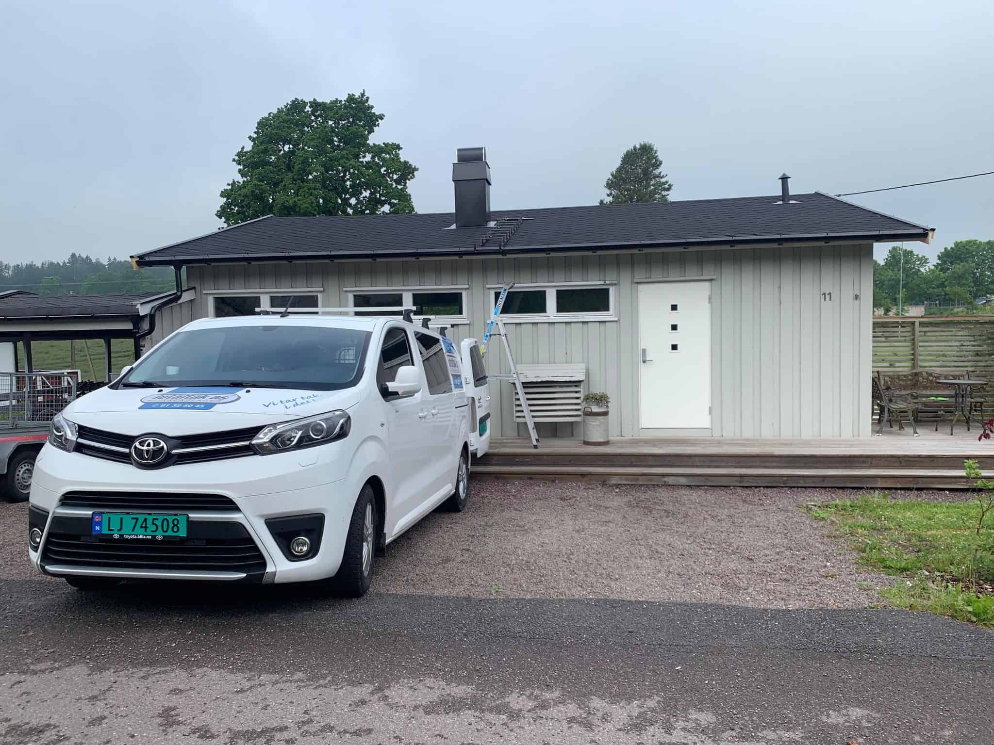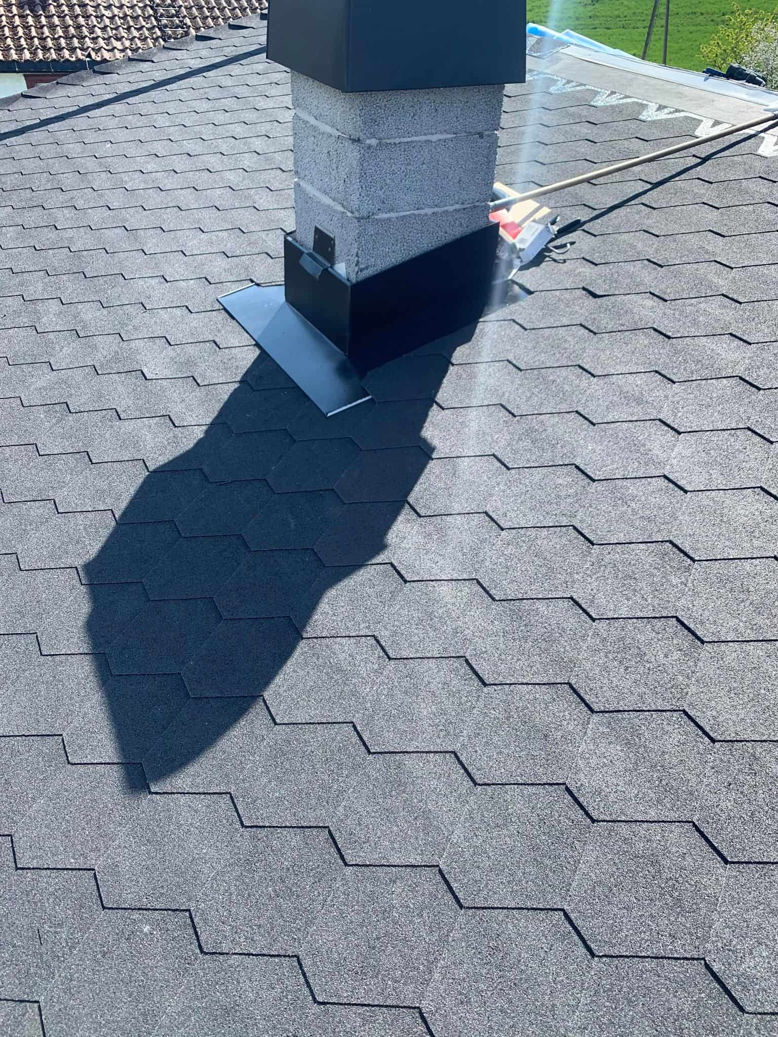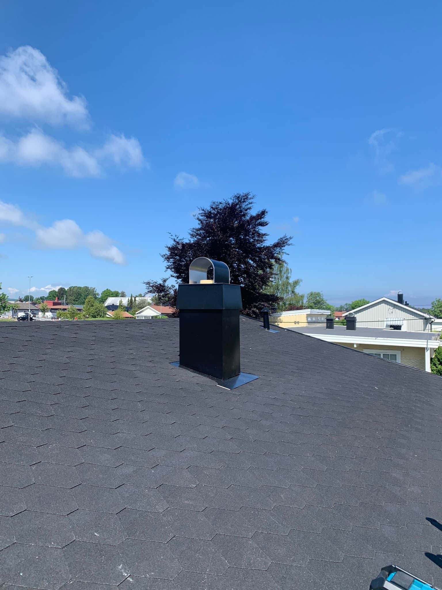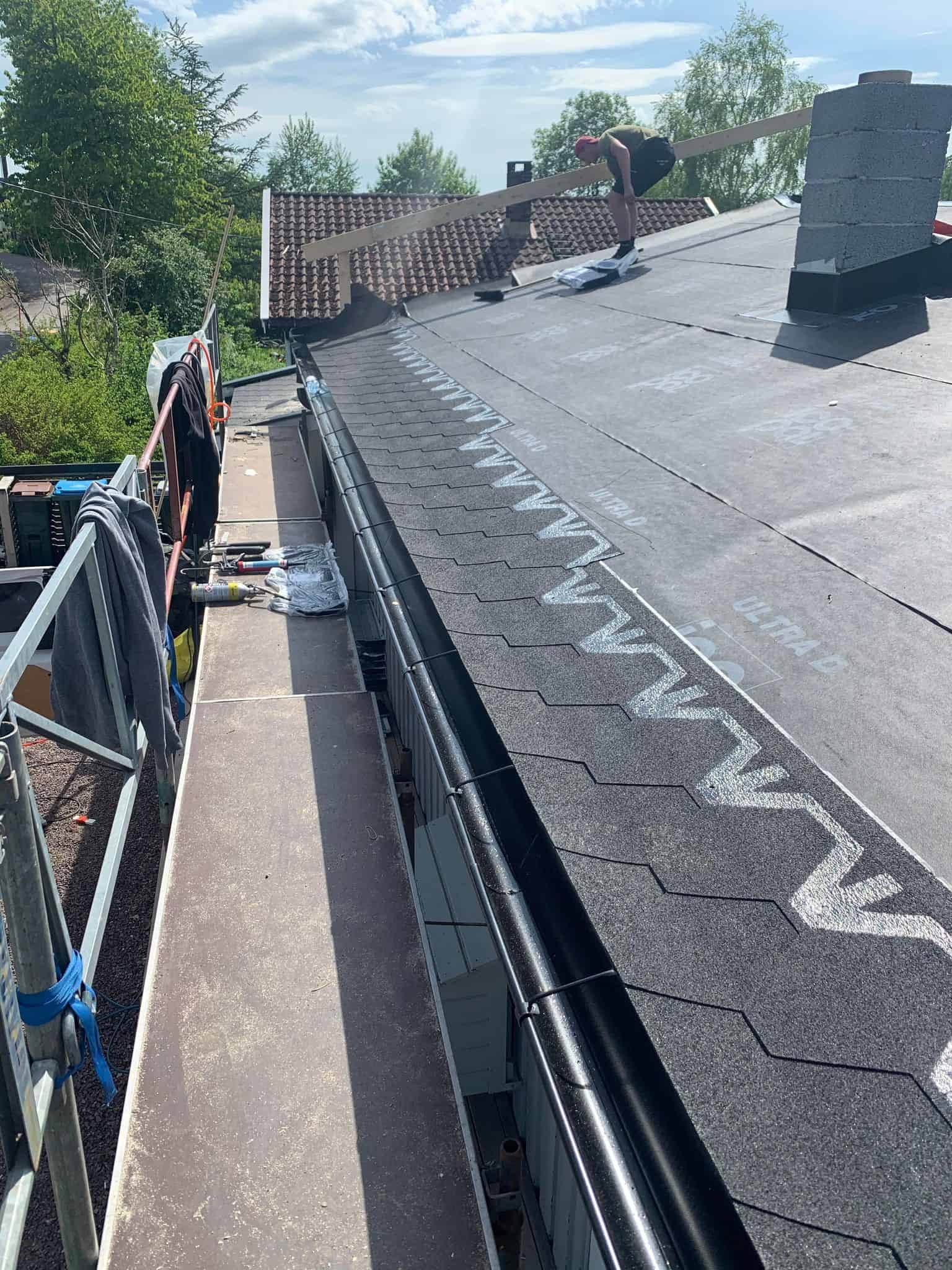 Sommeren 21 ble vi engasjert til en taktekking med takshingel hos en privatkunde. Her har vi revet av gammel takshingel, samt byttet rupanel som hadde fuktskader. Så har vi lagt ny undertakspapp på taket, før vi utførte en skikkelig undertetting av alle gjennomføringer og la ny takshingel i farge kullsort. Beslag og renner i farge sort Hps.